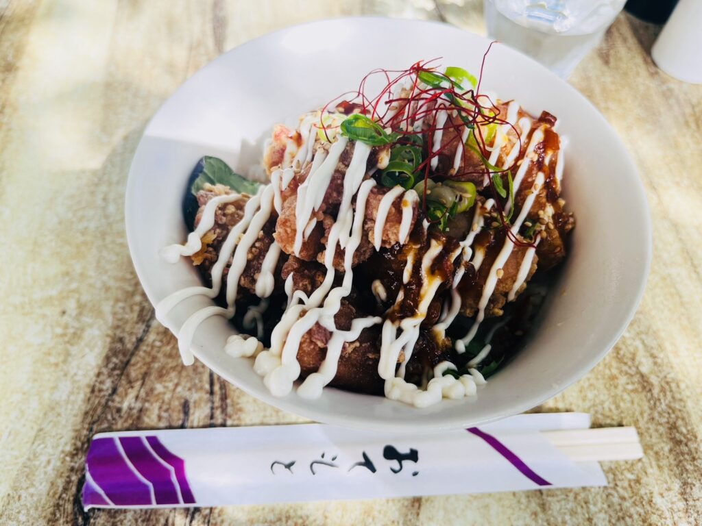 衣はからっと軽く、お肉はやわらかジューシーな200てん満点のからあげに、ピリ辛のマヨソースが絶妙にマッチ。ソースは辛くないのも選べるので、お子様も安心です☺️